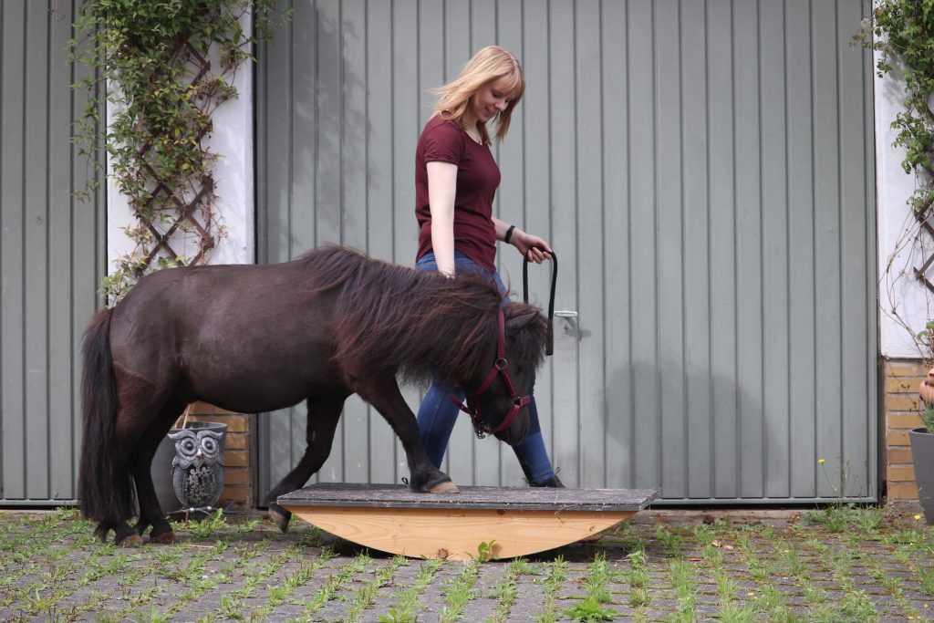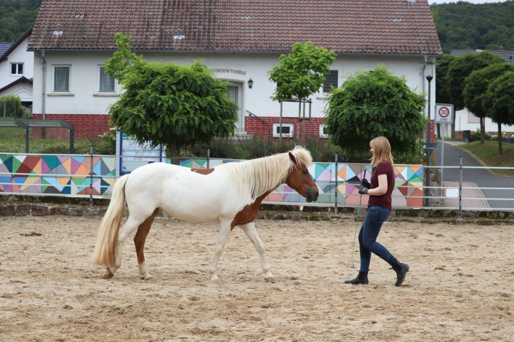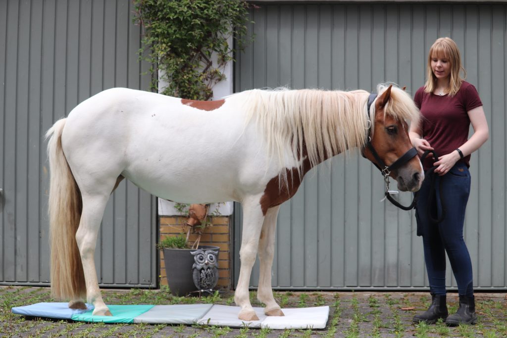 Mir geht es dabei nicht darum, das Pferd zu desensibilisieren, sondern vielmehr darum, dass das Pferd selbstsicherer wird und mutig auf neue Dinge zu geht. Deswegen arbeite ich beim Gelassenheitstraining kleinschrittig und mit positiver Verstärkung. So lernt das Pferd, dass es sich lohnt, auf Neues zu zu gehen und ihr stärkt ganz nebenbei eure Bindung und das Vertrauen ineinander.